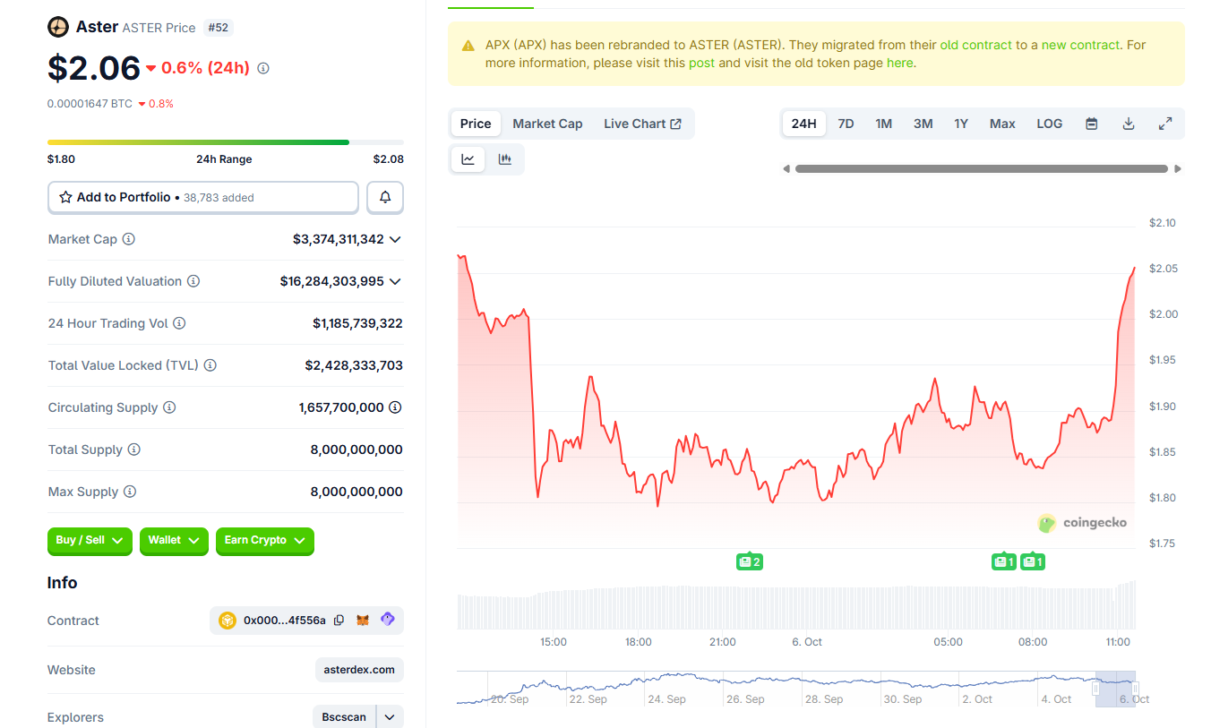 Aster has rallied above $2 on the Binance Spot Listing news and is now below its price peak at $2.31. Aster expects a rally to $4 with increased spot trading. |Source: Coingecko.