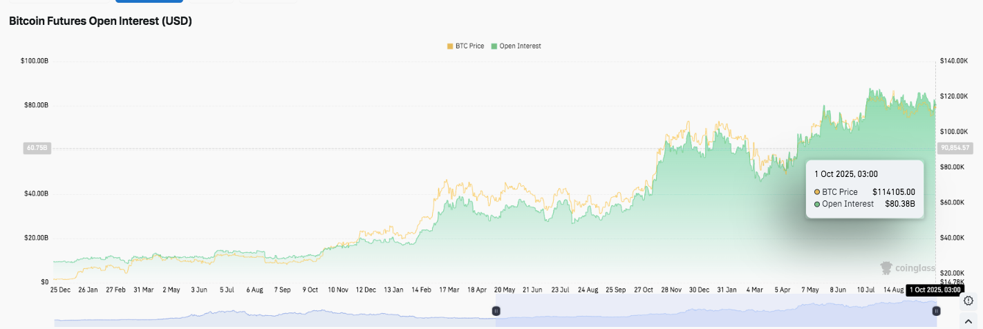Open interest in Bitcoin futures has skyrocketed throughout 2025, rising from under $20 billion earlier this year to over $80 billion in October. This growth indicates an increase in speculative activity and an increase in institutional participation.