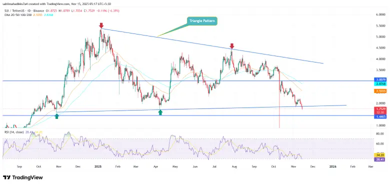 With today’s drop of over 7%, the SUI price shows a decisive breakdown below the support trend line of a well-known technical pattern called the triangle. Since November 2024, the coin price has resonated within two converging trend lines in a pattern, driving a long-term sideways trend in the market.