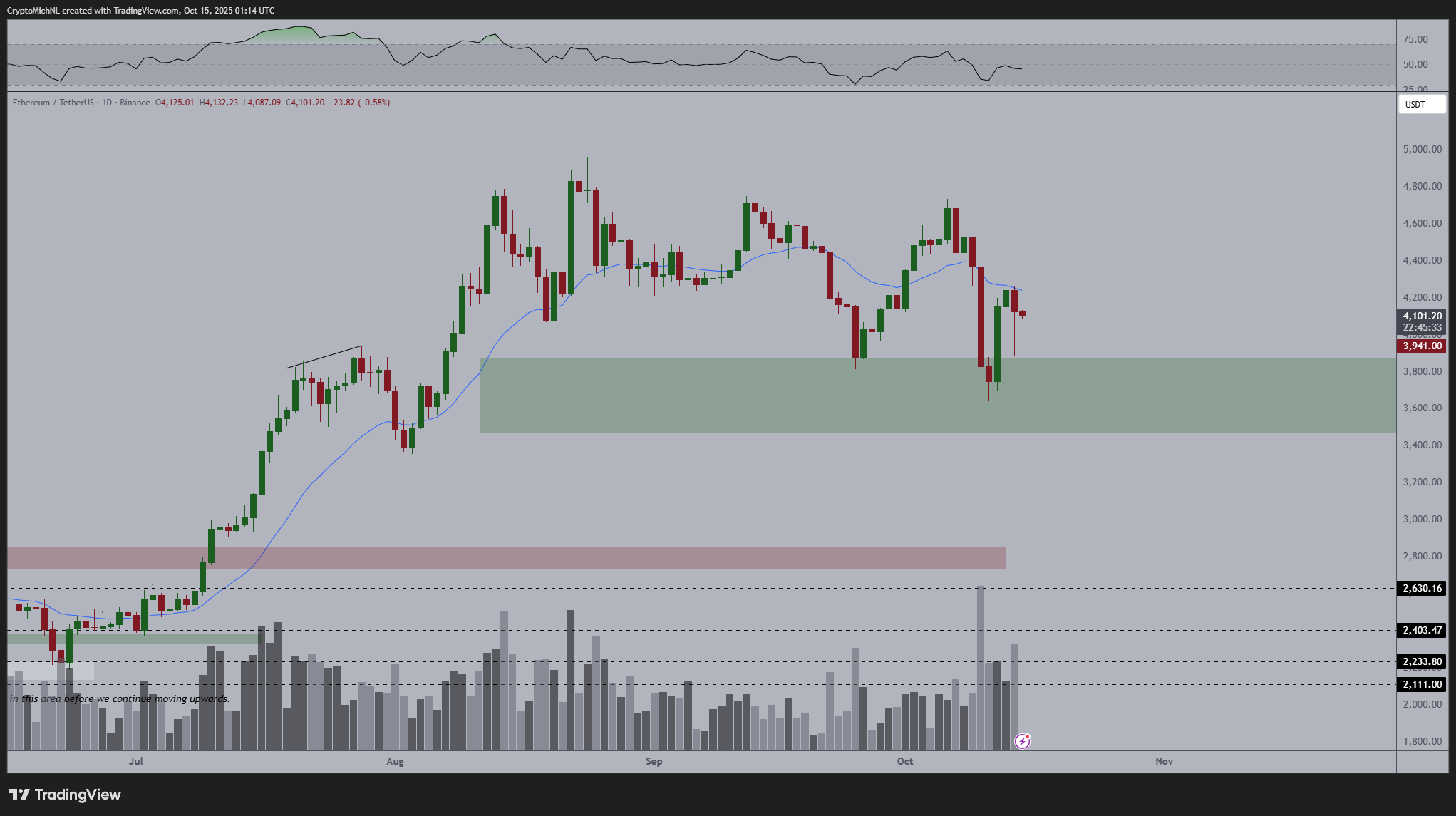 His chart shows ETH rebounding from the $3,600 to $3,900 zone that has held as support during past tests. As of the latest update, ETH was trading around $4,100 after falling from $4,600. Trading volumes are starting to increase again, which may indicate new demand.